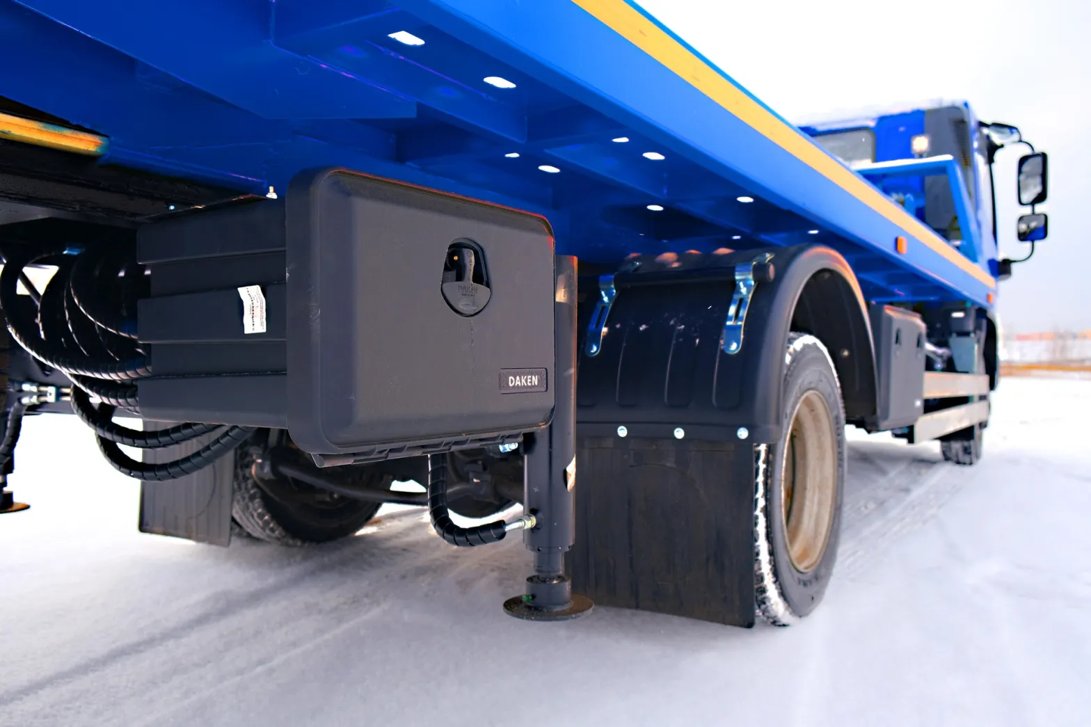 Эвакуаторная надстройка установлена на длиннобазное шасси бескапотного грузовика «Валдай 8». Межосевое расстояние – 4000 мм, общая длина автомобиля – 8000 мм. Большой угол поворота колес (до 45 градусов) обеспечивает хорошую маневренность.